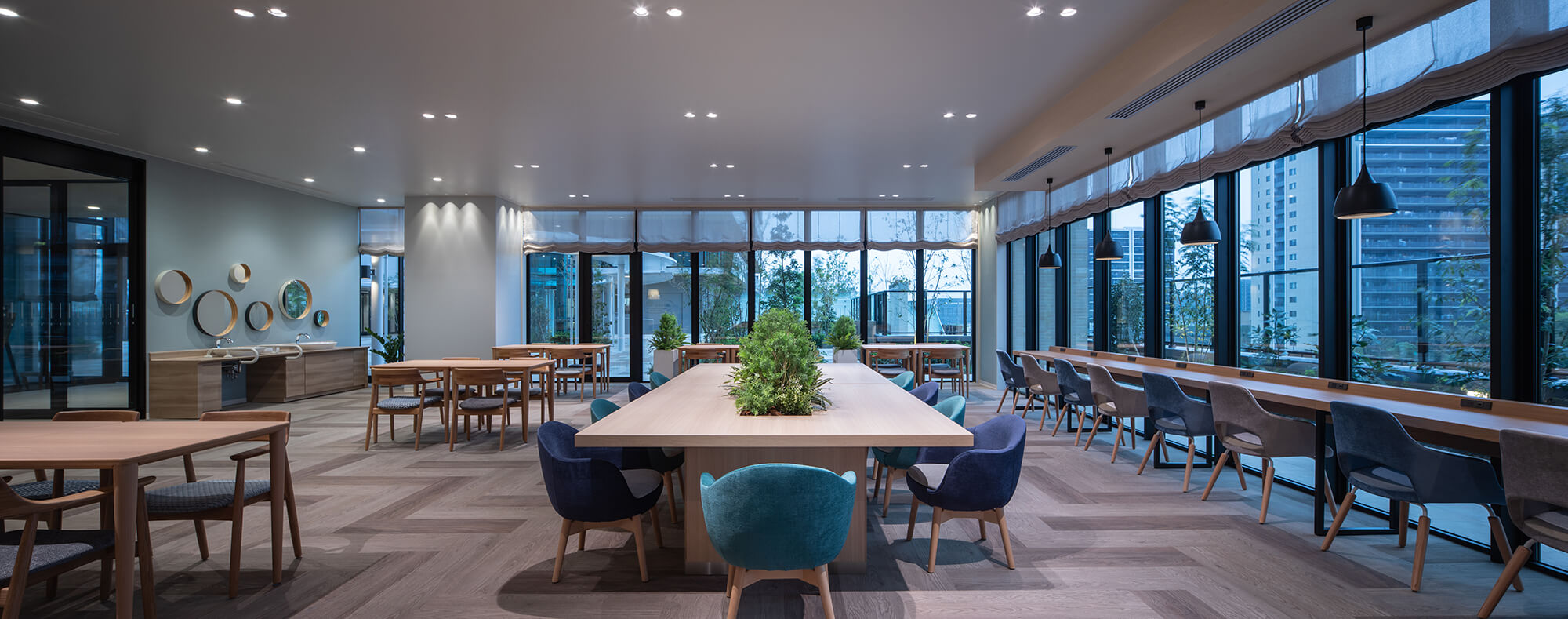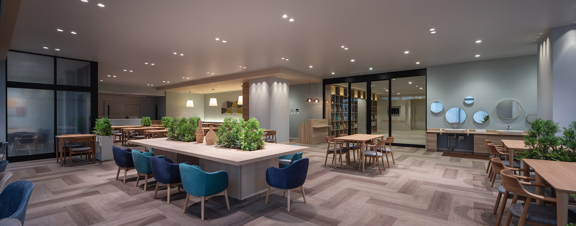 福岡市東区のアイランドシティにある、住宅型有料老人ホームの共用部(レストラン・エントランス他)のインテリアを計画した。